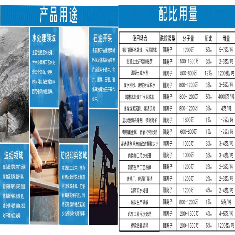 油田三次采油去油劑陰離子PAM:可以調(diào)節(jié)注入水的流變性,增加驅(qū)動液的粘度,改善水驅(qū)波急效率,降低地層中水相滲透率,使水和油能均速地向前流動。在石油開采方面只要用于油田的三次采油,每注入一噸高分子聚丙烯酰胺產(chǎn)品,可多采原油150噸作用。