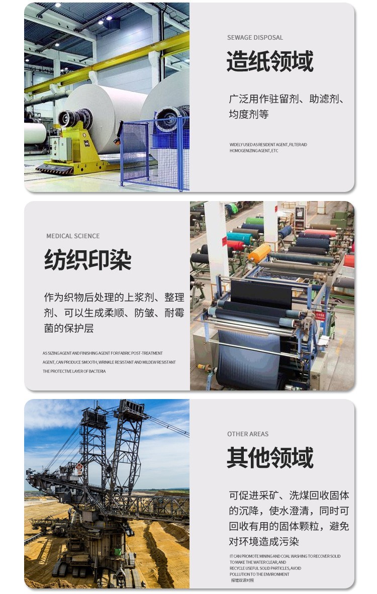 陰離子聚丙烯酰胺:是水溶性的高分子聚合物, 主要用于各種工業(yè)廢水的絮凝沉降,沉淀澄清處理,如鋼鐵廠廢水,電鍍廠廢水,冶金廢水,洗煤廢水等污水處理、污泥脫水等。還可用于飲用水澄清和凈化處理。由于其分子鏈中含有一定數(shù)量的極性基團,它能通過吸附水中懸浮的固體粒子,使粒子間架橋或通過電荷中和使粒子凝聚形成大的絮凝物,故可加速懸浮液中粒子的沉降,有非常明顯的加快溶液澄清,促進(jìn)過濾等效果。