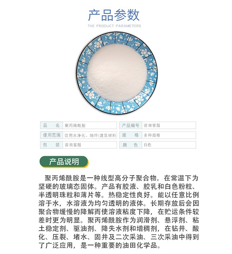 造紙助劑:在造紙工業(yè)中可用作紙張干強(qiáng)劑 助留劑 ,能極大的提高紙張質(zhì)量 節(jié)約成本,提高造紙廠的生產(chǎn)能力?梢灾苯优c無機(jī)鹽離子,纖維以及其它有機(jī)高分子發(fā)生靜電橋梁作用以達(dá)到增強(qiáng)紙張的物理強(qiáng)度,減少纖維或填料的流失。加快濾水 起到了增強(qiáng)  助留 助濾的作用,同時在脫模過程中起到了明顯的絮凝效果。